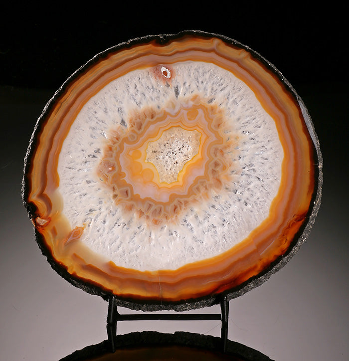 A thin-cut slice of a brazilian agate geode, with warm gold and brown tones. The stone is clear enough that light shines through it very easily! Sold with a metal display stand.
