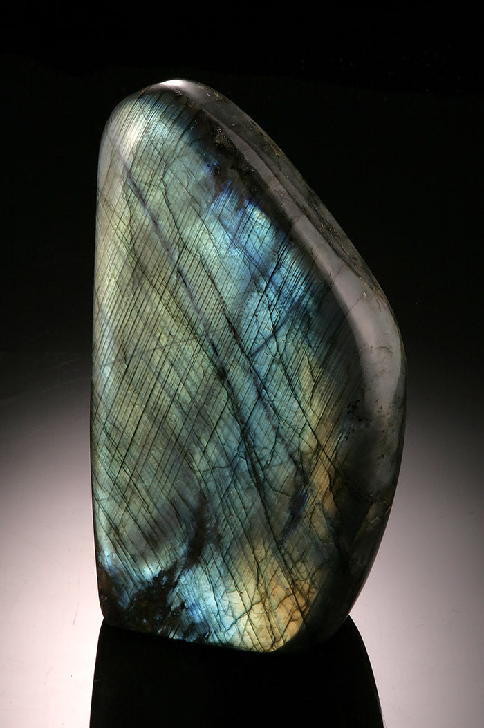 The never-ending paradoxical surprises hidden by Mother Nature show that laying under her rugged matrix exterior, an abundance of exquisite beauty exists. One should have no doubt of that after seeing an amazing, polished Labradorite specimen. Labradorite is in the feldspar family of minerals along with moonstone and sunstone. Labradorite originally came from the northeastern Canadian province of Labrador. Today it is found predominantly in Madagascar, though a prominent variety known as spectrolite is found in Finland. Originally Spectrolite was a trade name used only to refer to material from Finland. However, the term Spectrolite has been expanded to include Madagascar Spectrolite.
