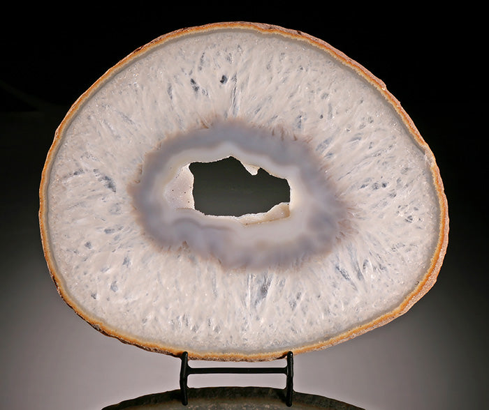 A thin-cut slice of a brazilian agate geode, with bright white and gray hues. The stone is clear enough that light shines through it very easily! Sold with a metal display stand.