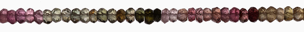 These strands of Tourmaline include the whole range of pink, green, to golden color. Each strand measures 15 inches. Each bead is approximately 4mm and cut into a faceted rondelle shape.