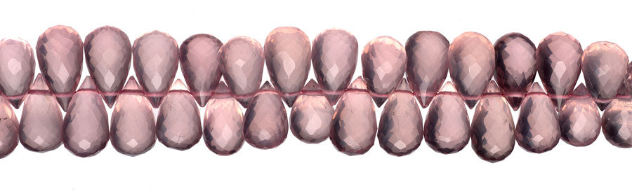 Gem quality Rose Quartz is rare and this strand is an exceptional example of gem material, exhibiting a deep pink color with superb clarity. They are cut into a round teardrop shape briollette that is top drilled. The strand measures 8 inches in length, each bead is approximately 5 x 8 mm.