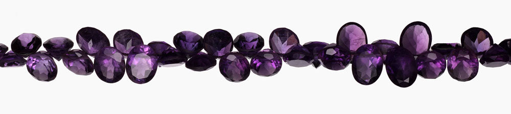 These Amethyst stones are facet cut, with an oval table of 5x7mm. They have been top drilled and come by a strand measuring 8 inches in length.