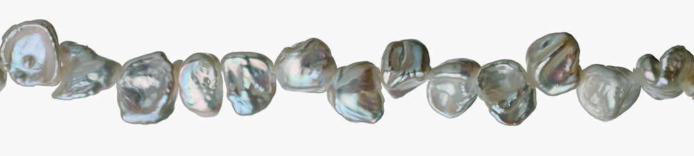 Natural freshwater pearls in a freeform Keishi style. These pearls capture the feeling of nature and the ocean.  They look beautiful alone but offer many opportunities to compliment a wide range of other materials. The color is white body with blue-pink luster, each pearl is roughly 6mm. Each strand measures 16 inches in length.