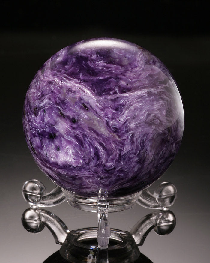Charoite is a complex mineral of very rare occurrence. Heat, pressure, and infusion of unique chemicals into a rock is responsible for the transformations into new minerals such as Charoite. The colors in each piece of Charoite range from bright lavender, violet, and lilac to dark purple, with white, gray, and black veining. It forms a swirling pattern of interlocking crystals that often demonstrate chatoyancy. It is found only in the Murinskii Massif, about 70 miles from the Chara River in SW Yakutia, Russia. The name Charoite is created from the Russian word “chary,” which means charms or magic, due to its beautiful visual effect when polished.