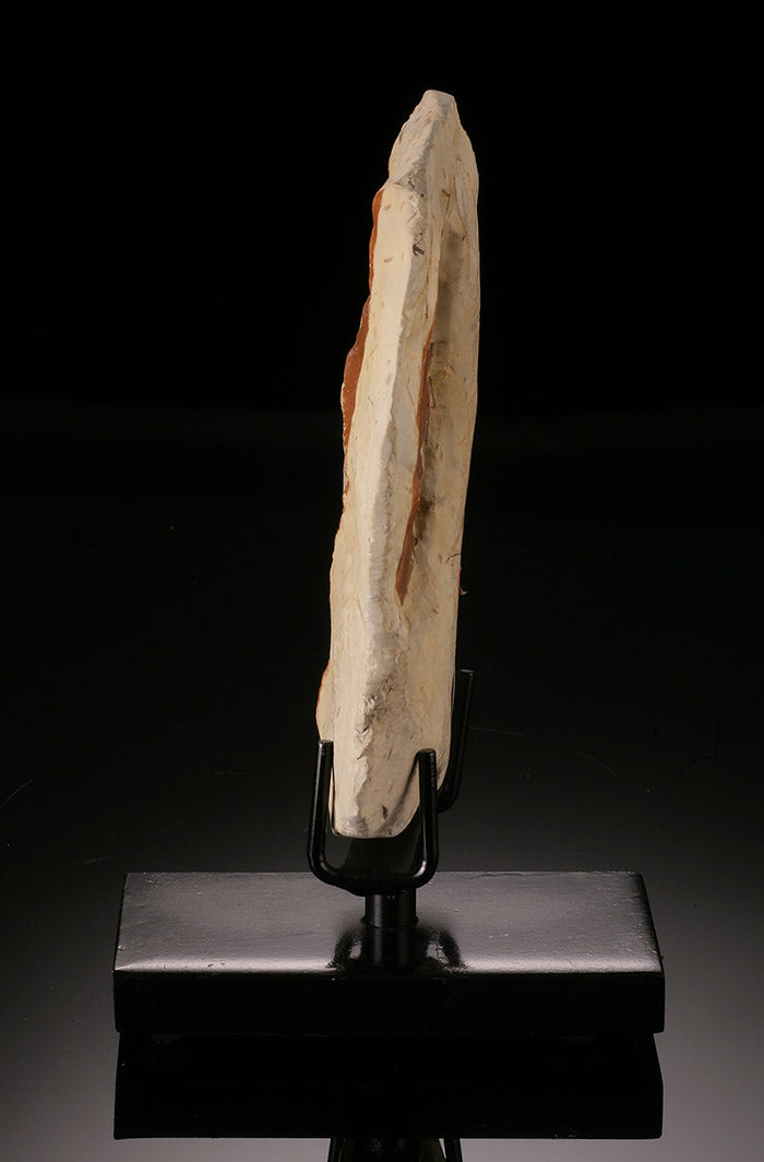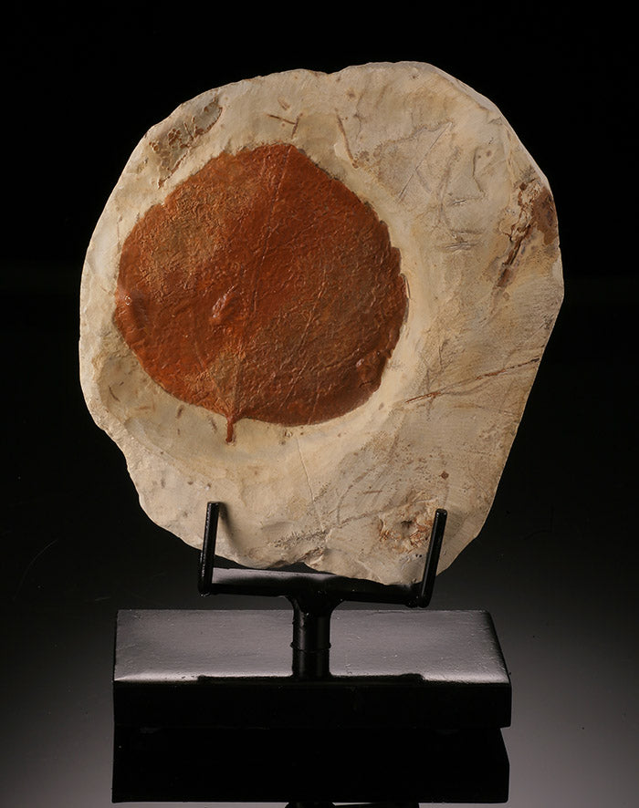 A natural, double sided leaf fossil displayed in a custom made stand. The leaf fossil swivels on the base so you can display either side easily!
