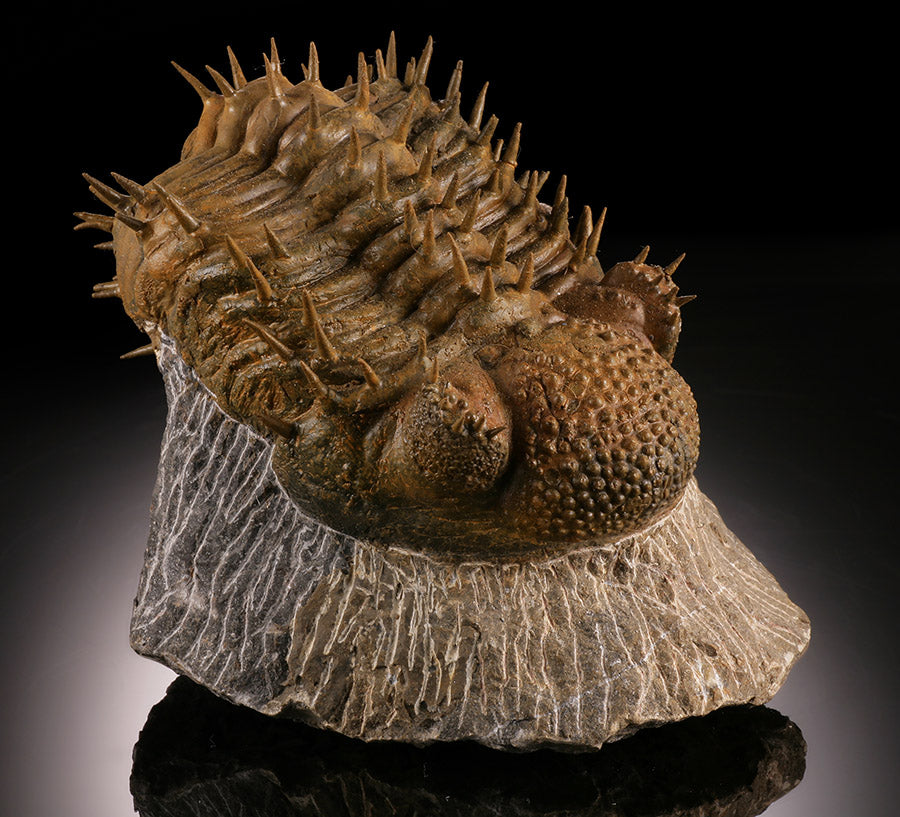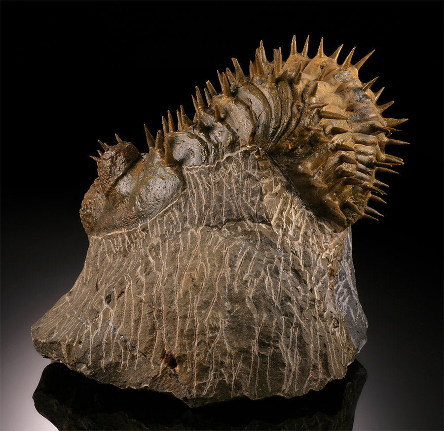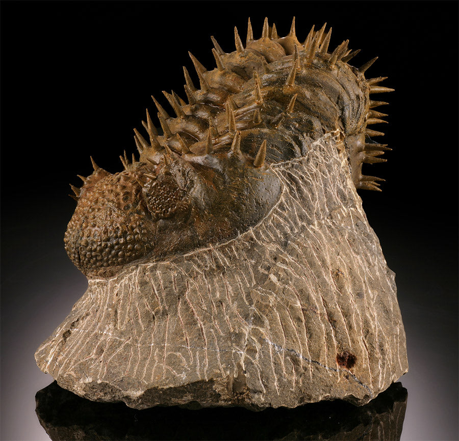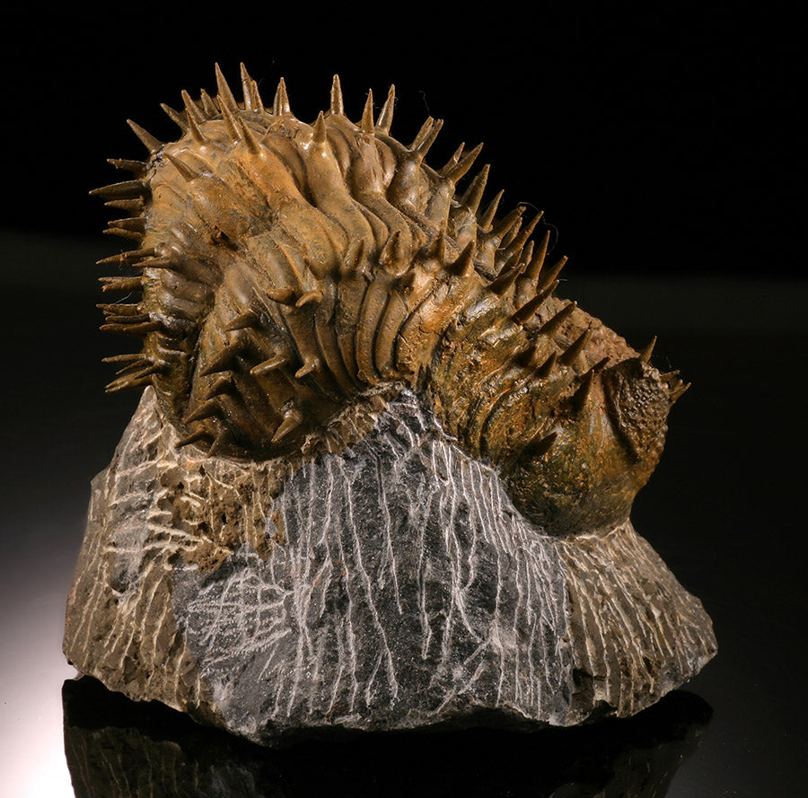Trilobites are extinct hard shelled marine arthropods with amazingly great diversity. It is estimated there were over 15,000 known species of Trilobita, making them the most diverse animal life form that ever existed on earth. In Morocco, new Trilobite specimens are being discovered every year. Trilobites are are important as paleo-zoic guide fossils, having existed for over 270 million years. They began their existence during the early Cambrian time period (520 mya), long before dinosaurs existed but went extinct around 250 mya, before dinosaurs died out.