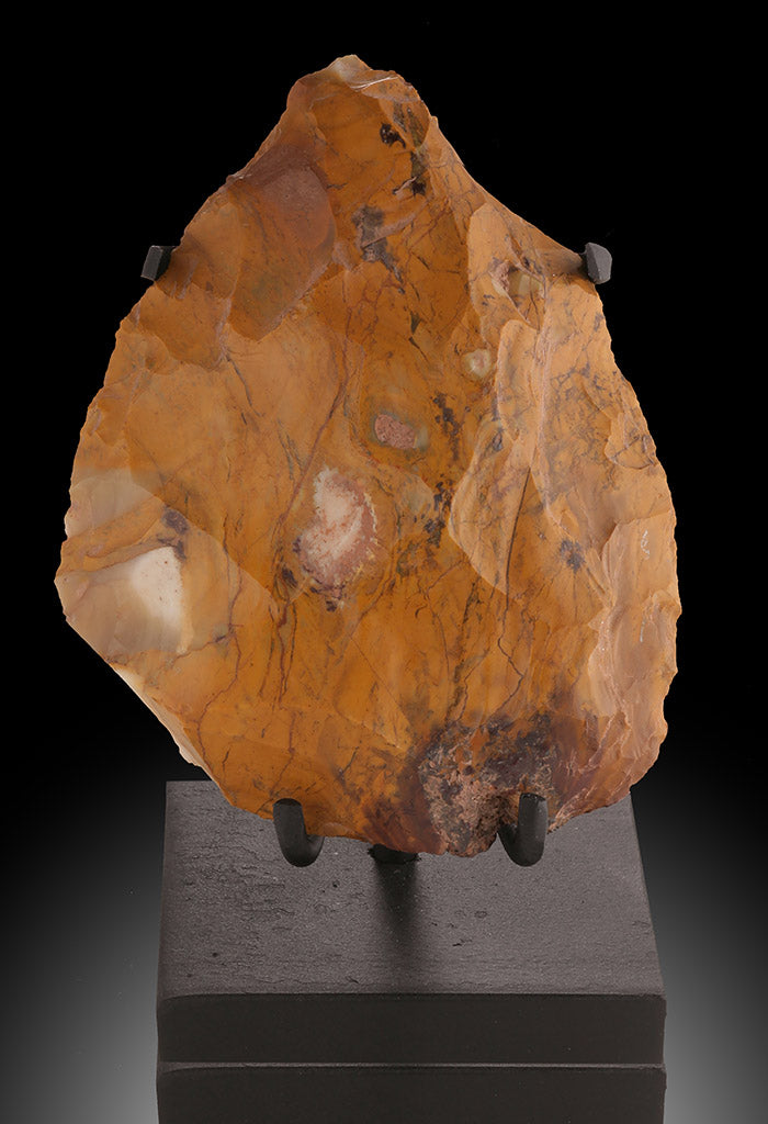 A beautifully crafted bificial tool made of multicolored Jasper. The edges are still sharp and it has retained nice overall shape. Includes a custom made metal stand.