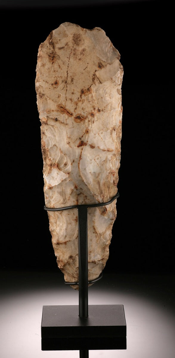 A show-stopper hand axe from Oise, France. Standing 9" tall, this is sure to spark conversation and would be a great centerpiece of any collection. The axe is bifacial with fascinating two-tone patina (off white and dark brown). We stand by the provenance of all our material and can provide a letter of authenticity upon request.