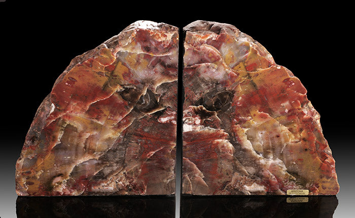 From ancient Greek meaning "wood turned into rock", Petrified Wood is a form of fossilization where all the organic matter combines with minerals (usually a silicate, such as quartz) during a process called per-mineralization. In order for wood to become petrified it must be completely covered by sediment, thereby depriving the wood of oxygen. Simultaneously, there must be a mineral rich water source close by. Over time, the water delivers the minerals into the cellular structure of the wood, replacing (and in most cases), combining with the organic material, cell by cell, until the wood is transformed into stone. Wood petrification is unusual in this way. If acid were used to dissolve into the stone, one would actually still find organic material. In regard to petrified wood colorization, each specimen is dependent upon other minerals present in the locality at the time of fossilization. Streaks of warm browns and reds are indicative of iron oxides intermixing with quartz and other minerals during a specimen's fossilization process.