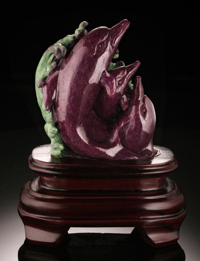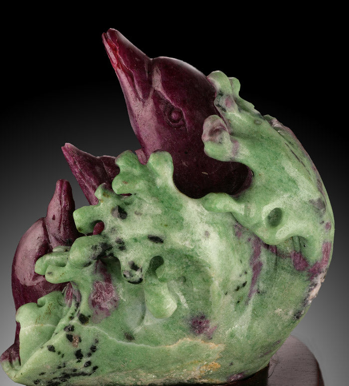 Three dolphins carved of solid ruby within a 'splash' of ruby zoisite matrix! A gorgeous and detailed carving made of the highly sought after mineral, and July birthstone... Ruby. The carving sits in a custom made wooden base for easy display. The largest dolphin measures ~3-1/4" long.