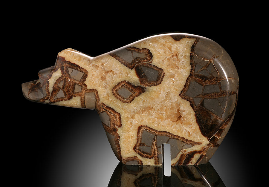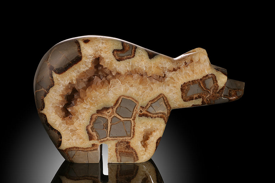From the Henry Mountains of Utah, the mineral Septarian formed in an ancient sea floor some 50-70 million years ago as sediment collected around sea life as they decomposed. Calcium carbonate from the shells of these creatures began to take a new form over time, creating calcite crystals and bands of aragonite. The gold-colored crystals inside are calcite, the brown is aragonite, and the outer surface is composed of limestone.