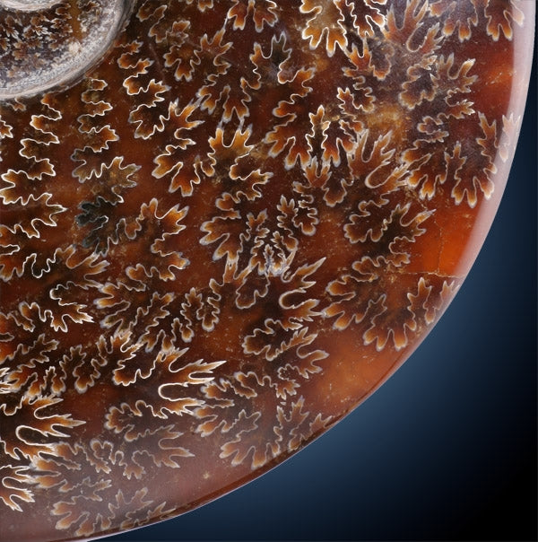 The chambers of Ammonites were separated by a tissue called septa. One can see the separations of the chambers by means of complete wavy line called a "suture pattern". The suture pattern is the line separating the septa and chambers, and is visible underneath the animals aragonitic shell.
