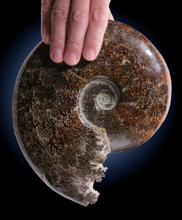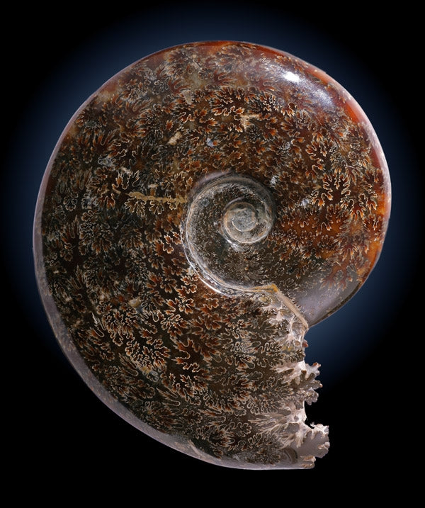 Ammonites are an extinct group of marine animals in the Cephalopoda class. They are invertebrates and are more closely related to coleoids (squids, octopus, and cuttlefish) than they were to the chambered nautilus, even though they looked much more similar to the later. The name Ammonite was derived from "ammonis cornua," translated to mean Horns of Ammon. Ammon was an Egyptian god that was typically depicted wearing ram's horns, whose spiraled shape is similar to that of an Ammonite. Ammonites first appeared in the oceans during the Devonian Period, some 400 million years ago. They died out around 65.5 million years ago along with the dinosaurs.