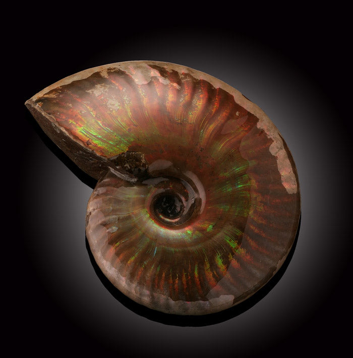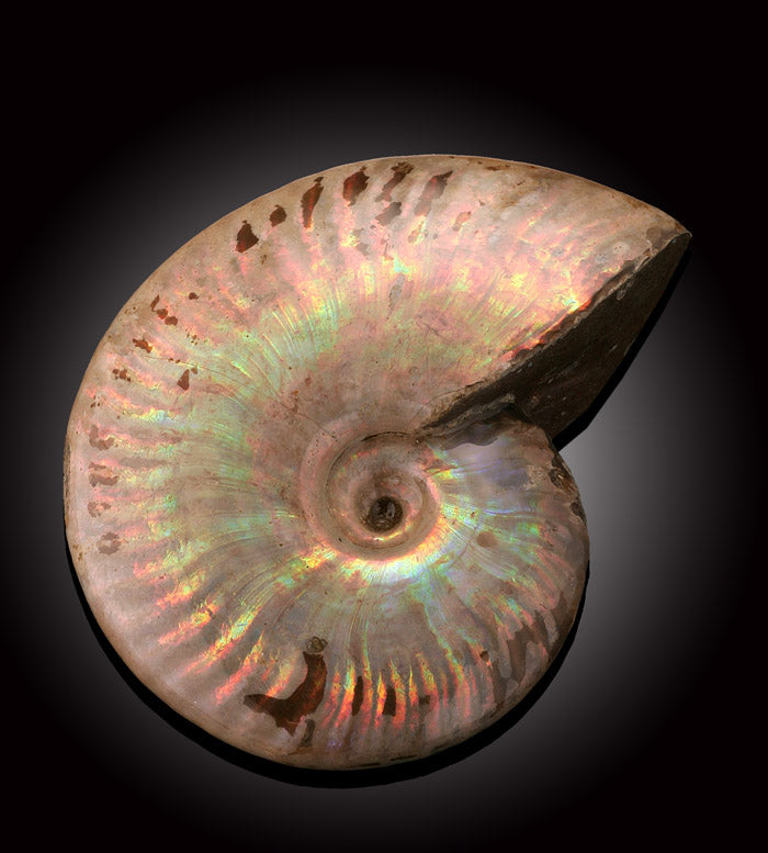 Ammonites are an extinct group of marine animals in the Cephalopoda class. They are invertebrates and are more closely related to coleoids (squids, octopus, and cuttlefish) than they were to the chambered nautilus, even though they looked much more similar to the later. The name Ammonite was derived from "ammonis cornua," translated to mean Horns of Ammon. Ammon was an Egyptian god that was typically depicted wearing ram's horns, whose spiraled shape is similar to that of an Ammonite. Ammonites first appeared in the oceans during the Devonian Period, some 400 million years ago. They died out around 65.5 million years ago along with the dinosaurs.