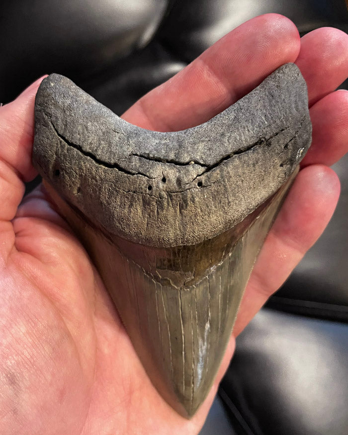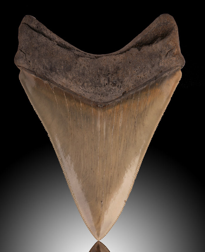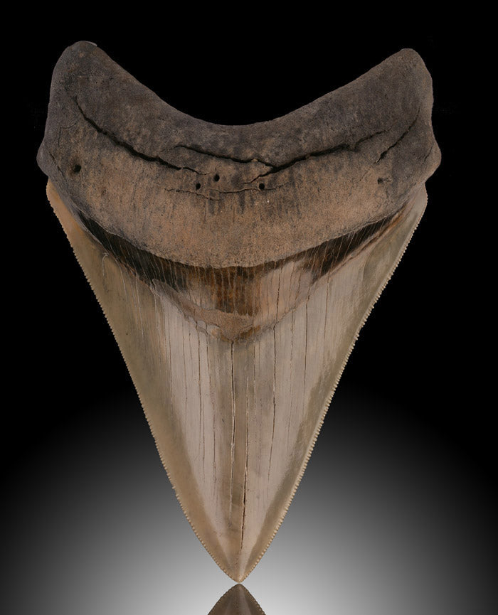 Carcharodon Megalodon (meaning giant tooth) was the largest and most powerful predatory fish that has ever lived. Megalodon also had the strongest bite force of any animal that has ever lived, at up to 18 tons. That bone crushing jaw strength allowed it to commonly hunt whales for its meals. Its teeth were similar in structure to today's Great White but significantly larger. Some Megalodon teeth have been measured over 7" in length. Compare that to the average 3" tooth size of a modern Great white and one can begin to imagine the size and power of Carcharodon Megalodon. The beast could grow to over 30 meters long.