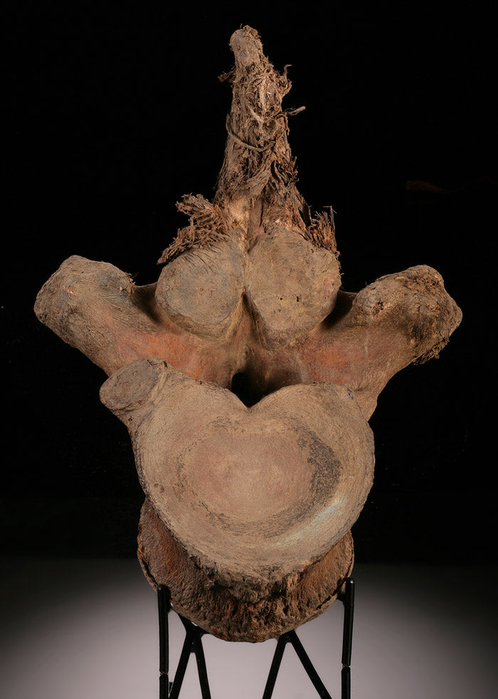 From an old collection in Germany is this unusual vertebrate specimen with tissue still attached to the top process. An excellent example from the Ice Age time period. A simple metal display stand is included.