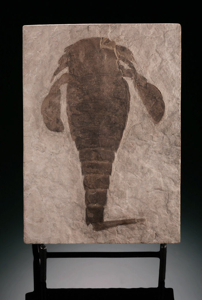 Eurypterids, commonly known as Sea Scorpions, are an extinct group of arthropods that are related to arachnids and include the largest known arthropods to have ever lived. Prevalent during the Silurain and Devonian ages, eurypterids were segmented aquatic arthropods, with compound eyes, and two club-like claws. Some species exhibit toothed claws, and may therefore have been predators. Though they are globally dispersed, eurypterid fossils are uncommon in the fossil record because of the special conditions needed for preservation of their exoskeleton that was not mineralized. Thus, fossils sites preserving them are generally restricted to Lagerstätten, which are deposits known for the exceptional preservation of fossilized organisms or traces. Such conditions existed in several fossils site within New York’s Bertie group from which this Eurypterus remipes comes. Eurypterus remipes is the state fossil of New York.