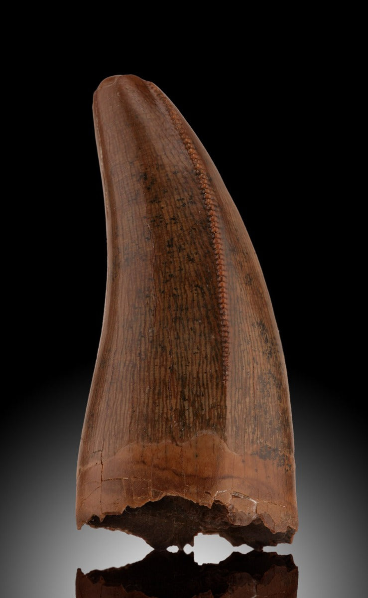 One only needs to look at this pristine tooth to see that it's a AA grade T-rex specimen. Outside two minimal hydration lines and a couple of small serration flaws, this might be one of the finest T-rex teeth we've come across in a long time. The enamel is beautiful with perfect coloration from the region of its discovery.