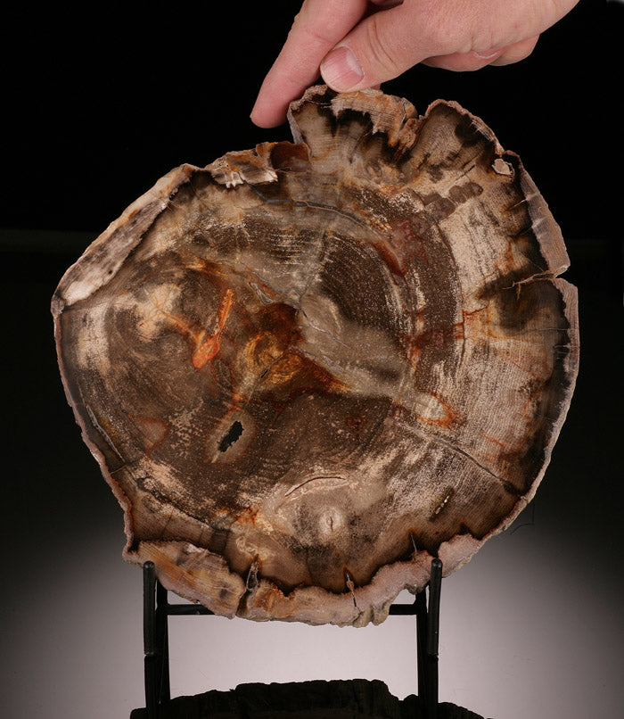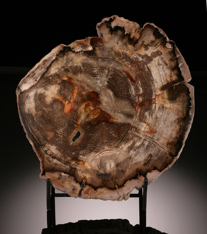 From ancient Greek meaning "wood turned into rock", Petrified Wood is an unique form of fossilization. In some instances all the organic matter has been replaced by minerals (usually a silicate, such as quartz) during a process called permineralization / replacement. However, many petrified wood specimens undergo a unique fossilization process, where silicates bond with the cellulose structure of the wood, thereby preserving organic matter. Regardless of the process, in order for wood to become petrified it must be completely covered by sediment, thereby depriving the wood of oxygen and providing a mineral supply. Over time, water delivers the minerals into the cellular structure of the wood, replacing or bonding with the organic material, cell by cell, until the wood is transformed into stone. The color of each piece is dependent upon other trace minerals present in the locality at the time of fossilization. Streaks of warm browns and reds are indicative of iron oxides present during a specimen's fossilization process.