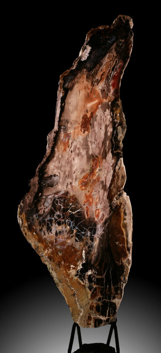 An elongated slab of petrified wood with a high polished front side and rough along the outer edges. Sold with metal stand.
