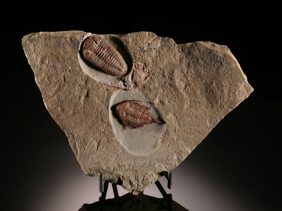 We are proud to offer this rare and exceptional Trilobite mortality plate, consisting of a rare Uralichas joined by a Dalamantina specimen. The preparation is phenomenal. all the spines of the Uraliichas have been relieved of matrix, with the preparation continuing underneath the specimen. The prep work gives that specimen a floating look, as it has been so nicely articulated. A museum grade piece and gem for any serious collector.