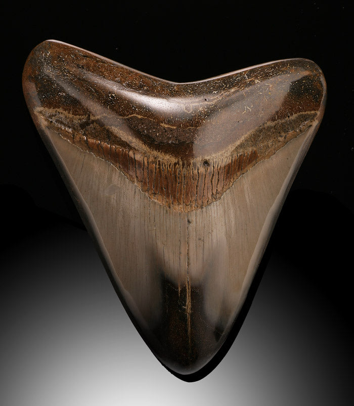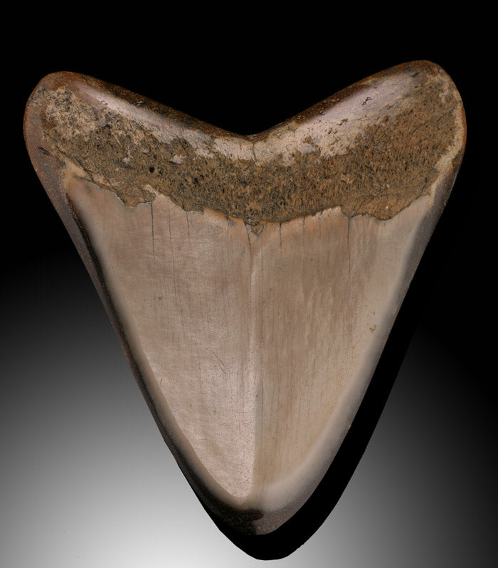 Carcharodon Megalodon (meaning giant tooth) was the largest and most powerful predatory fish that has ever lived. Megalodon also had the strongest bite force of any animal that has ever lived, at up to 18 tons. That bone crushing jaw strength allowed it to commonly hunt whales for its meals. Its teeth were similar in structure to today's Great White but significantly larger. Some Megalodon teeth have been measured over 7" in length. Compare that to the average 3" tooth size of a modern Great white and one can begin to imagine the size and power of Carcharodon Megalodon. The beast could grow to over 30 meters long.