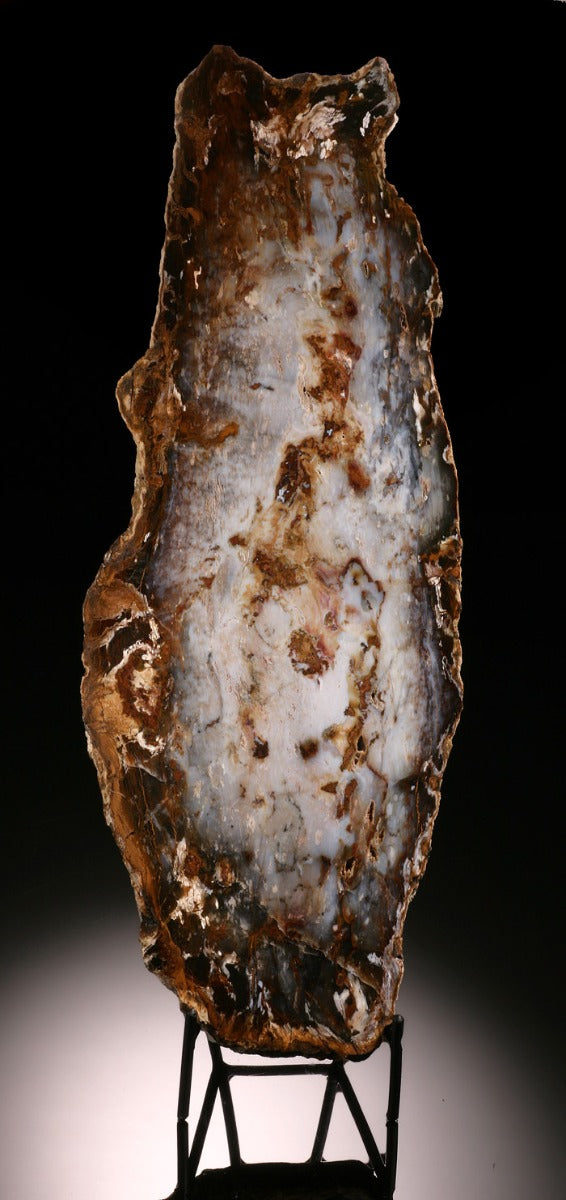 Long slab of petrified wood with a bright white/gray quartz interior and brown and black patterning throughout. The front is high polished, the back is stabalized with a thin film, and the outer edges are left in their rough, natural form. Sold with stand.