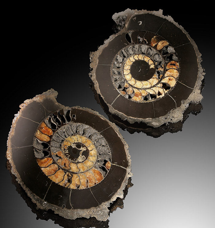 Pyritized Ammonites are considered some of the most collectable type of Ammonite fossil specimens. Iron Pyrite, also known as "Fool's Gold" enters the Ammonites chambers, replacing the animal's structure cell by cell. When the cellular replacement process goes just right, a magnificent fossil specimen such as the one pictured is created. The name Pyrite is derived from the Greek πυρίτης (puritēs), "of fire" or "in fire," from πύρ (pur), "fire.”