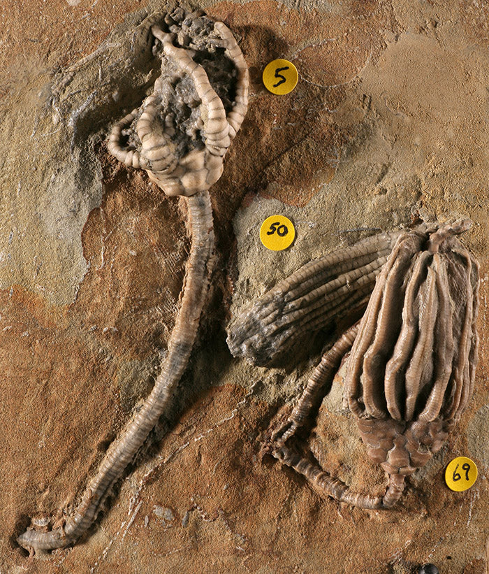 Crinoids began life some 530 million years ago. They are plant-like sea creatures, some of which either root themselves underwater or gently float along the sea bed, gathering tiny organisms for nourishment. Crinoids often resemble flowers planted in the sea floor, giving them their name from the Greek word for "Lilly." Crinoids are remarkably adaptable animals and they are a good example of what is referred to as a "living fossil", as many different species live today but only deep in our seas and oceans.