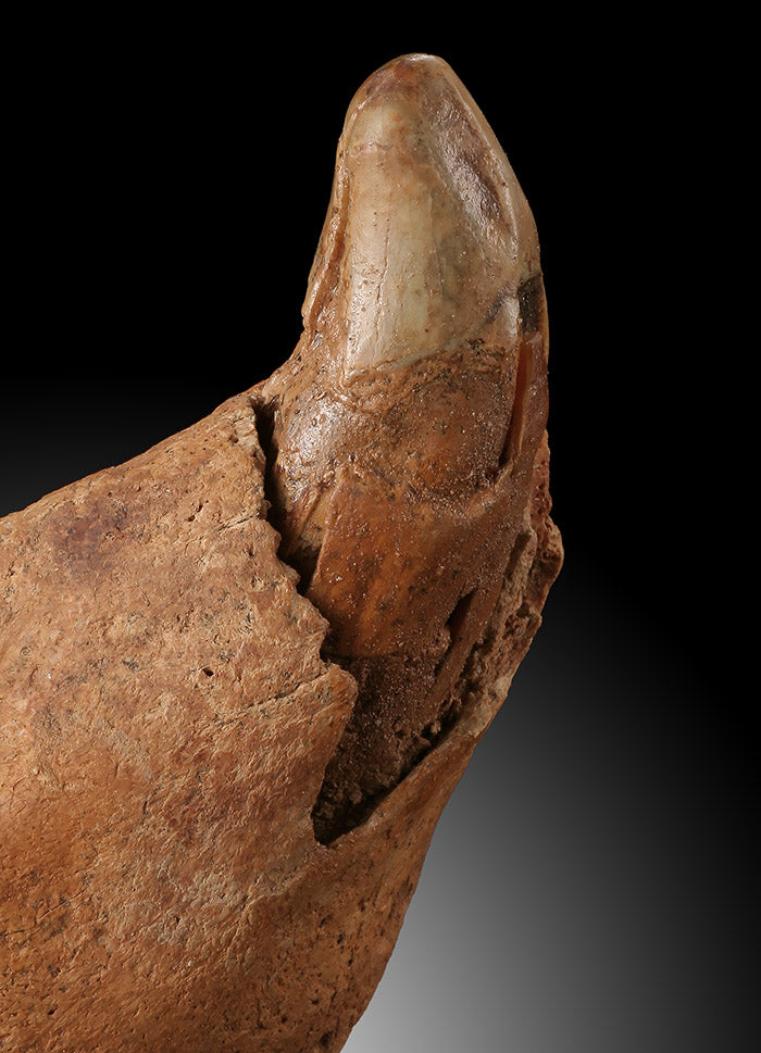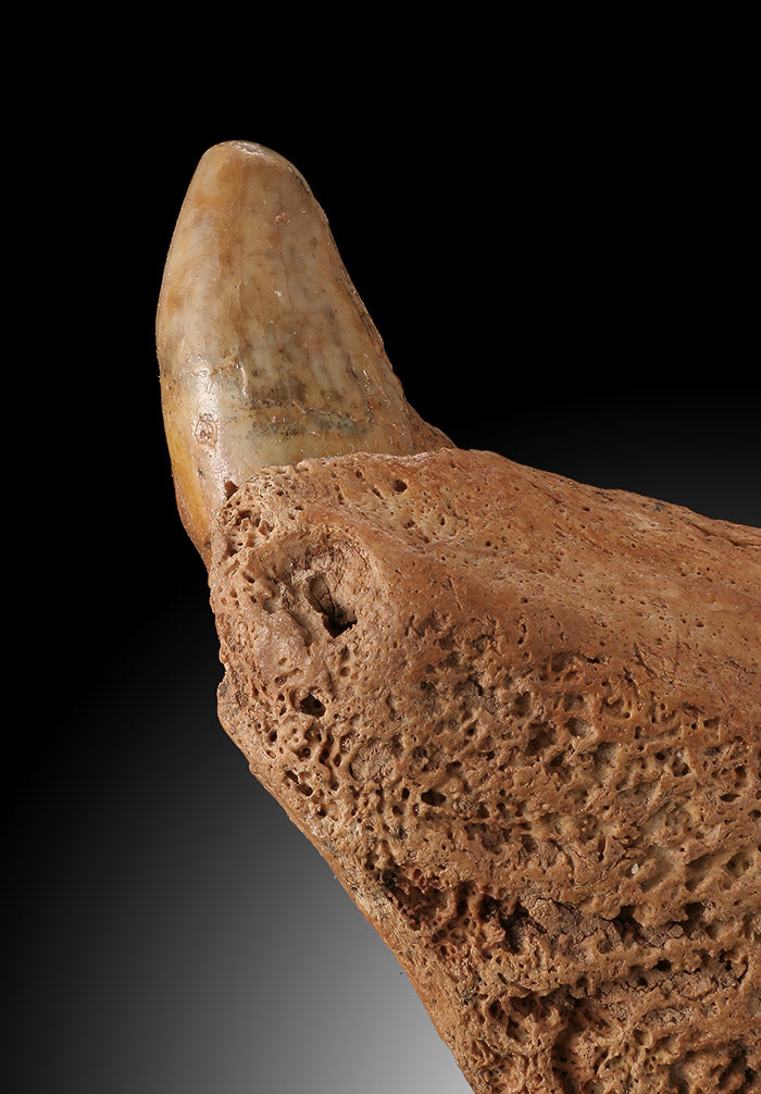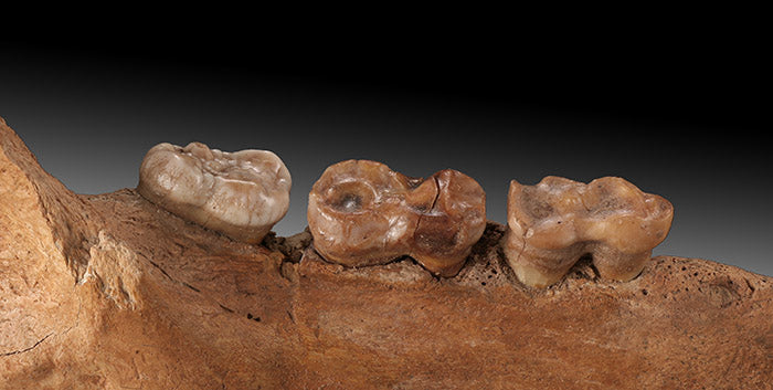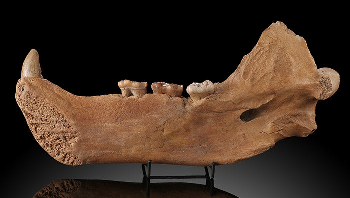 This jaw bone has three large molars, measuring up to 1-¼" in length, and an exposed canine tooth. The preservastion and preparation are top notch; it feels like a solid fossilized bone without sandy or crumbled matrix! Sold with a metal stand.