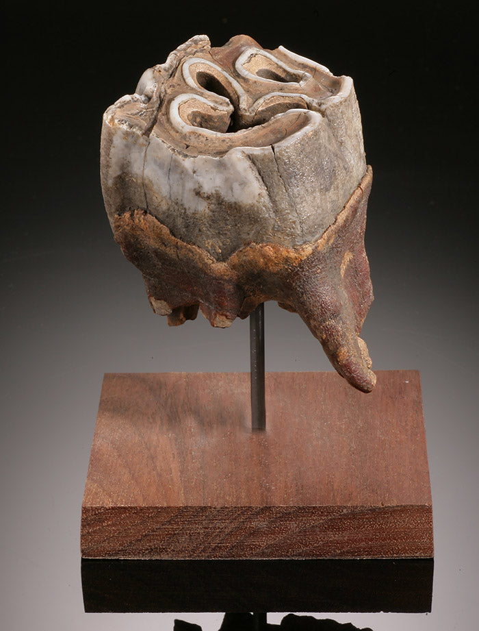 This is a Coelodonta antiquitatis (Woolly Rhino) tooth without restoration and with a partial root extension exposed. This piece is sold with a custom made metal stand.