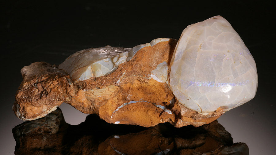 Opal is composed of hydrated silica. It is an amorphous silicate, meaning it does not form crystals. Opals are structurally composed of tiny spheres of silica, which when arranged in perfect geometry create the famous play of color associated with the stones. The arrangement of silica balls acts like a prism, which allows the rainbow spectrum of colors to be visible to the naked eye. Opal has been a stone of myth and mysticism for thousands of years. It was once worn for protection against sorcery and to enhance a person’s magical qualities. The idea that Opals are unlucky came about in 1829 after the publication of Scottish novelist Sir Walter Scott’s book Anne of Geierstein. In the novel, an Opal amulet signifies the downfall of the heroine, and this act of literature negatively affected the entire Opal industry for generations.
