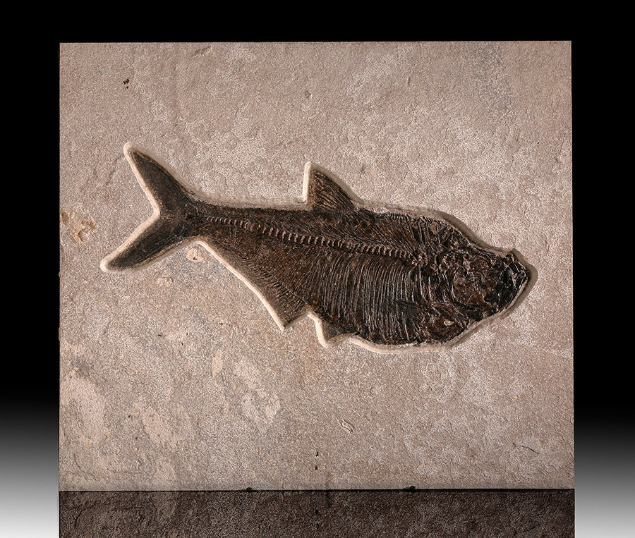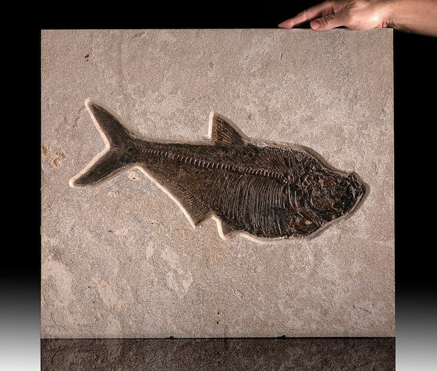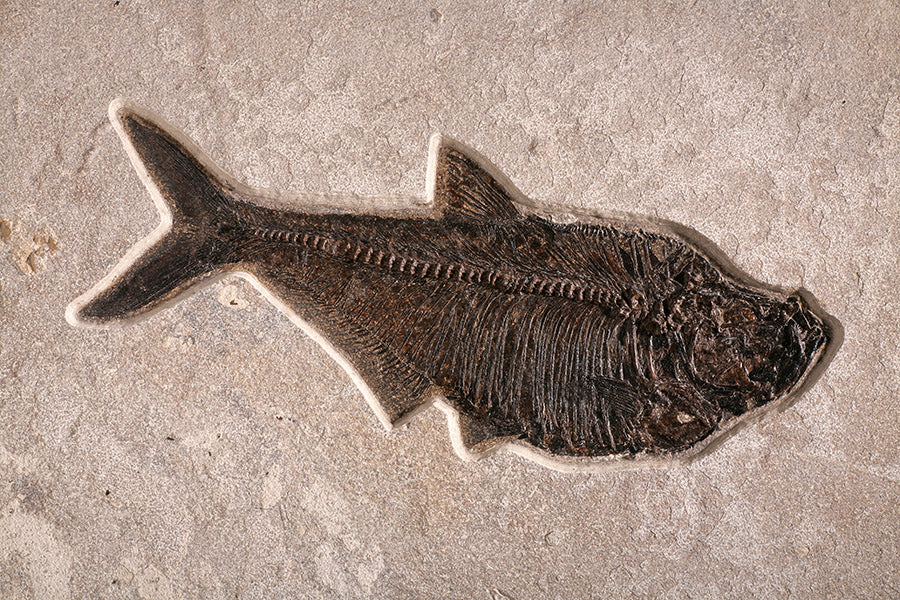 The Green River Formation in the USA covers an area over 25,000 square miles and is more than 2,000 feet thick. This formation, dates back more than 50 million years. It is one of the largest documented accumulations of sedimentary rock in the world. At the time, the area was sub-tropical and many different species flourished. Knightia lived in schools and were an abundant food source for larger predatory fish. Knightia are in the same family as herring and sardines.Diplomystus dentatus was one of those Green River fish and was related to today's herring. They were surface feeders, with their diet consisting of smaller fish, such as Knightia.