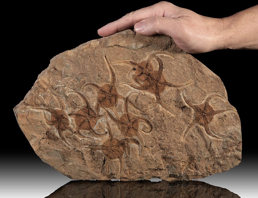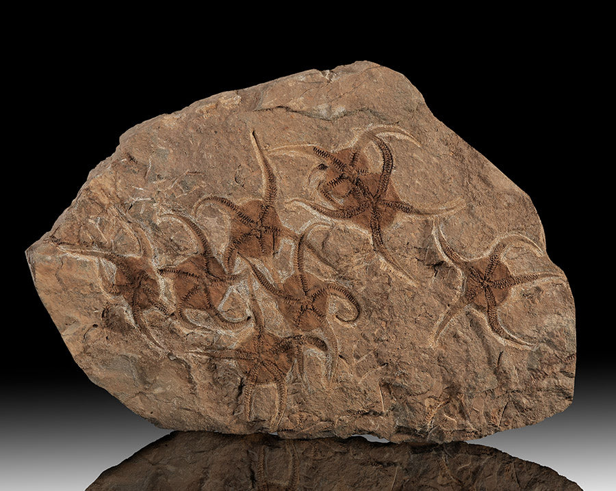 Sea stars, or starfish, tend to have legs that are wider and more connected to one another. They had tubular feet enabling them to move. Brittle stars on the other hand had narrower, more flexible arms that they wiggled in order to move around the sea floor. The type of brittle star fossils found in Morocco are of the genus Ophiura and are characterized by a disc-like body with long, thin legs radially arranged around it. In fossil plates their wavy arms give the appearance of dancing.