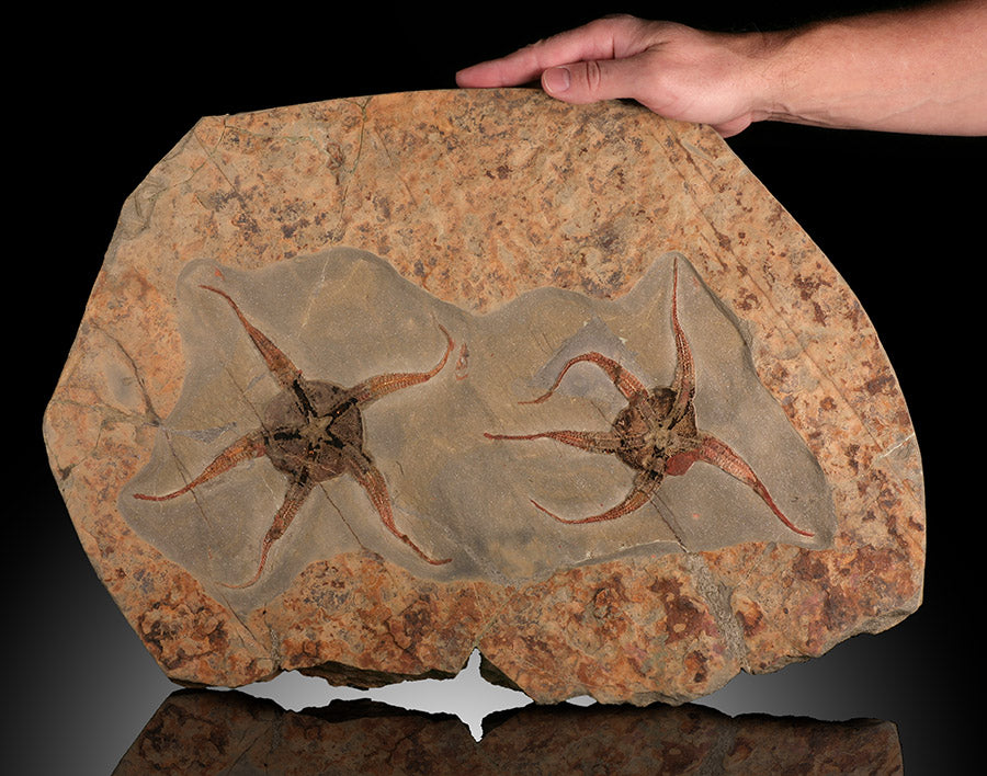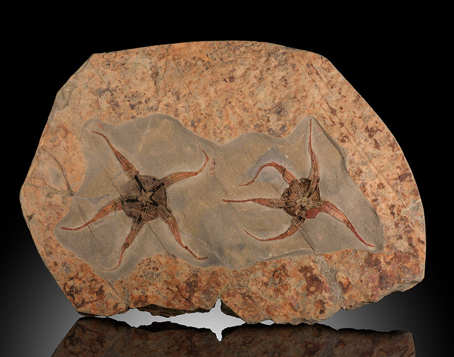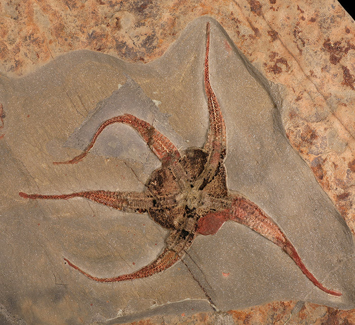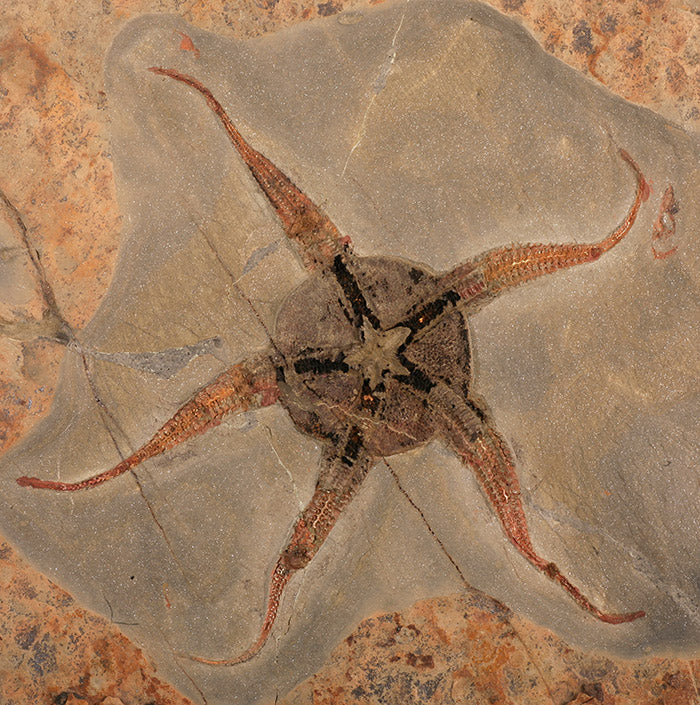 Sea stars, or starfish, tend to have legs that are wider and more connected to one another. They had tubular feet enabling them to move. Brittle stars on the other hand had narrower, more flexible arms that they wiggled in order to move around the sea floor. The type of brittle star fossils found in Morocco are of the genus Ophiura and are characterized by a disc-like body with long, thin legs radially arranged around it. In fossil plates their wavy arms give the appearance of dancing.