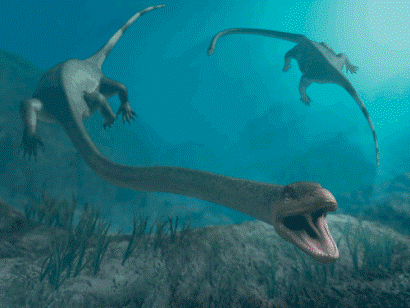 Plesiosaurs, (Plesiosarus mauritanicus) were gigantic marine lizards that were nearly as old as the dinosaurs. They made their first appearance during the Triassic period and became extinct at the end of the Cretaceous period. Plesiosaurs were among the largest creatures during their existence. They had extremely long necks, thick short bodies and short tails. Plesiosaurs had four paddle like flippers as appendages which they use to swiftly propel themselves through the water, similarly to today's penguins and turtles. Their powerful jaws filled with long sharp teeth were strong enough to bite through ammonites and other hard shelled sea creatures. Particular fossilized creatures found in the remains of Plesiosaurs indicates they may have been bottom feeders. Skeletal remains of Plesiosaurs have also revealed gastroliths in their stomachs. It's uncertain however if the gastroliths were used for digestion or to aid in their buoyancy. It was originally thought Pleisiosaurs crawled out of the ocean to lay eggs, but it has been confirmed these huge animals actually gave birth to live young, similarly to Mosasaurs. There is unproven speculation this prehistoric animal has somehow survived extinction as Plesiosaur is the type of creature people claim to see when describing the Loch Ness Monster in Scotland and there was an unproven claim of a Japanese fishing boat possibly snagging the remains of a Plesiosaur, on April 25, 1977.