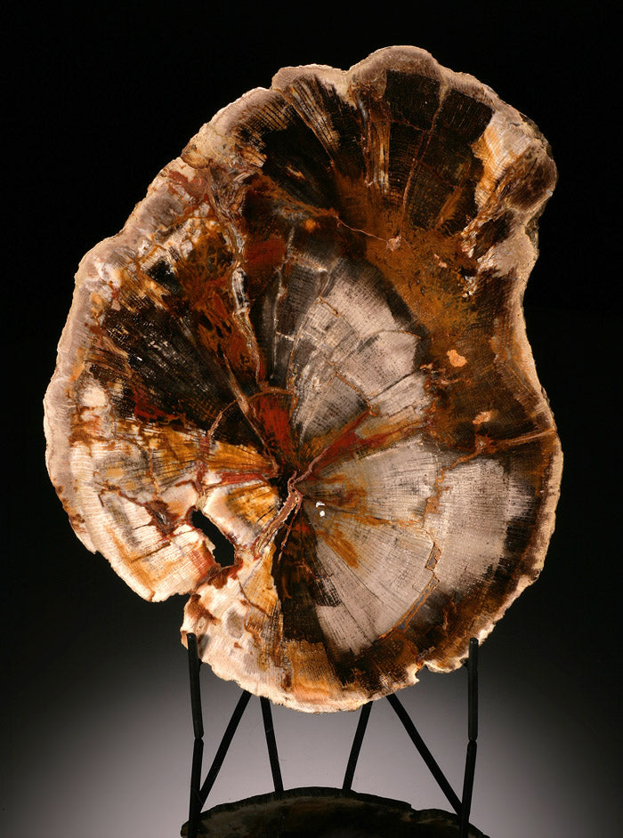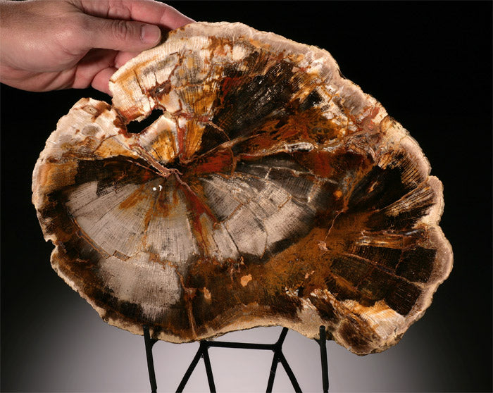 From ancient Greek meaning "wood turned into rock", Petrified Wood is an unique form of fossilization. In some instances all the organic matter has been replaced by minerals (usually a silicate, such as quartz) during a process called permineralization / replacement. However, many petrified wood specimens undergo a unique fossilization process, where silicates bond with the cellulose structure of the wood, thereby preserving organic matter. Regardless of the process, in order for wood to become petrified it must be completely covered by sediment, thereby depriving the wood of oxygen and providing a mineral supply. Over time, water delivers the minerals into the cellular structure of the wood, replacing or bonding with the organic material, cell by cell, until the wood is transformed into stone. The color of each piece is dependent upon other trace minerals present in the locality at the time of fossilization. Streaks of warm browns and reds are indicative of iron oxides present during a specimen's fossilization process.