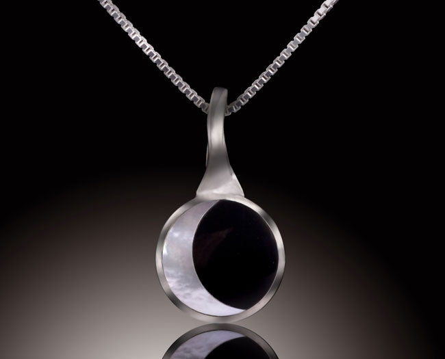 Phases of the Moon consists of Mother of Pearl and black mussel shell. Mother of Pearl is an organic-inorganic composite material produced by some molluscs as an inner shell layer and makes up the outer coating of pearls. The material is strong, resilient, and iridescent. The black mussel shell is finely polished until the texture is smooth and shiny.