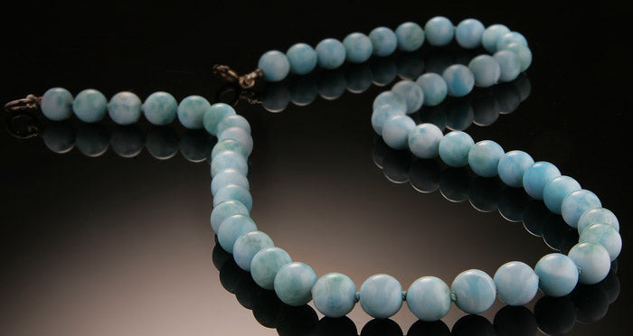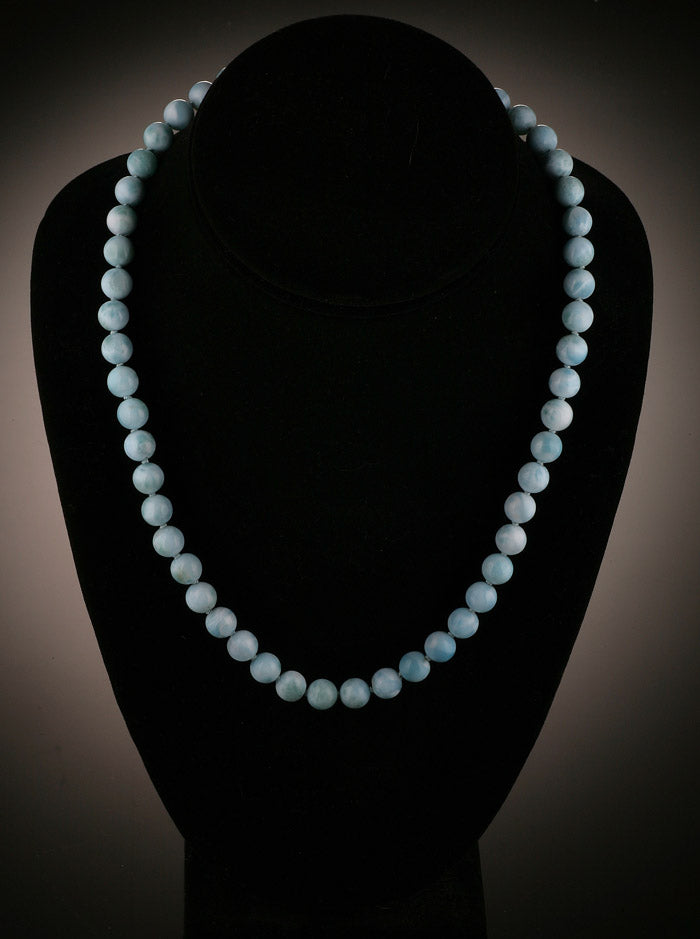 An elegant necklace made with round larimar beads and a sterling silver clasp. The necklace is knotted between each bead ensuring a soft, flexible feel and extra security.