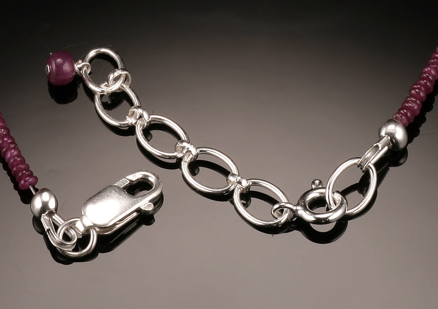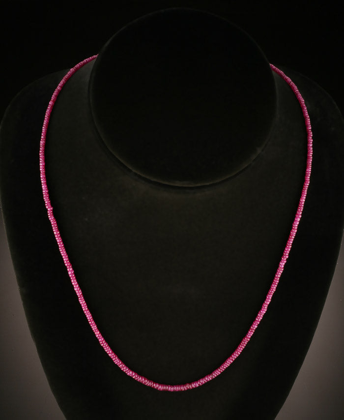 Polished roundelle Ruby beads measuring 2-3mm each strung on flexwire and finished off with a sterling silver clasp and extender chain.