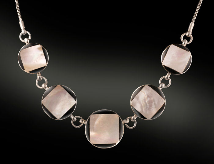 This necklace consists of Mother of Pearl and black mussel shell. Mother of Pearl is an organic-inorganic composite material produced by some molluscs as an inner shell layer and makes up the outer coating of pearls. The material is strong, resilient, and iridescent. The black mussel shell is finely polished until the texture is smooth and shiny.