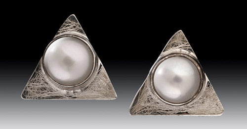 Asymmetrical set 8mm pearls in sterling silver triangle stud earrings. The inside has an "etched" pattern with a smooth outer edge.