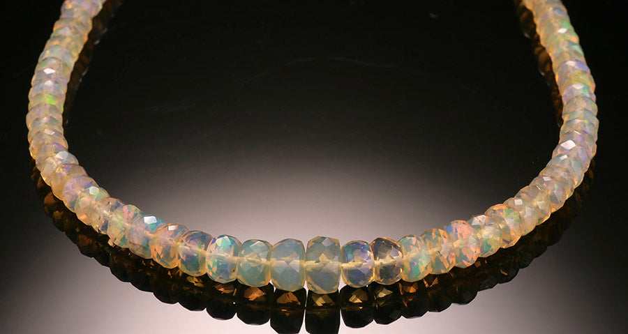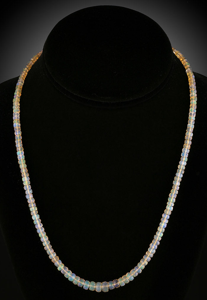Facetted roundelle Ethiopian Opal beads, graduated sizes tapering from 4mm to 7mm. The beaded portion measures 16" long, and can be clasped between 17" to 19" with the sterling silver clasp and chain extender. The opals are nice quality- clear and colorful!