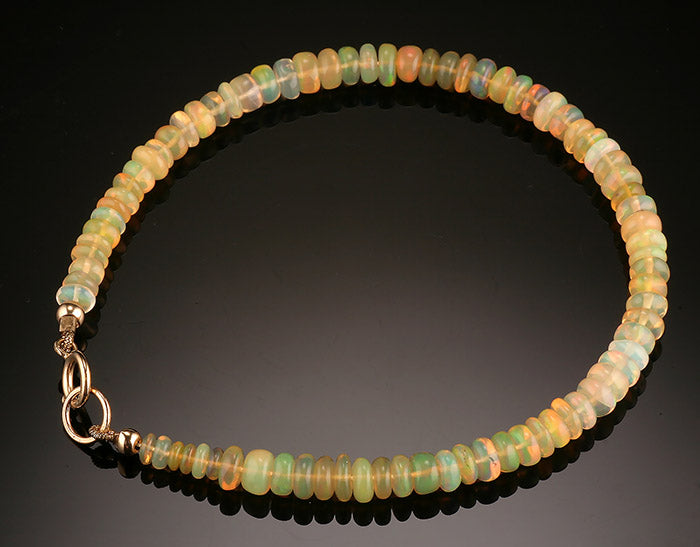 Polished roundelle Ethiopian Opal beads (5mm) strung into a bracelet that measures 7" length. The spring clasp and jump ring are made of 14k yellow gold.