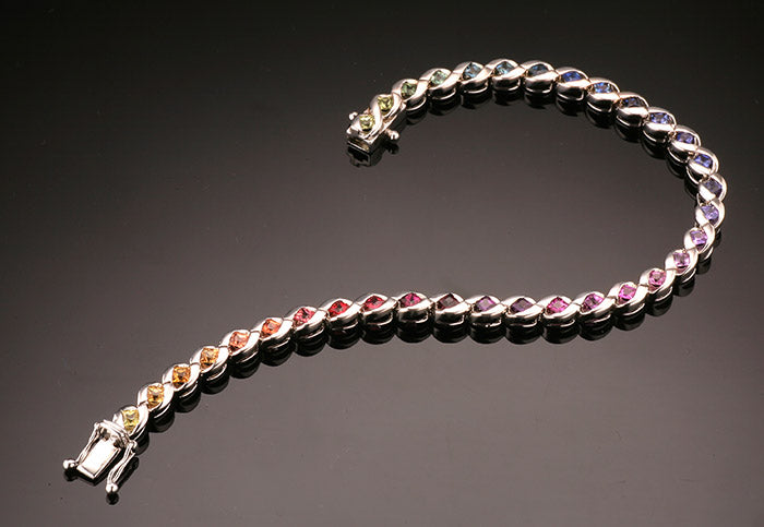 A stunning array of sapphires in a subtle color gradient that are delicately set in sterling silver. The stones go all the way around to the clasp, making it spectacular from every side/angle. The clasp has two “locking” mechanisms to make sure its safe and secure.