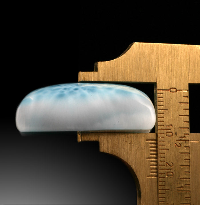 Larimar is a rare variety of pectolite found only in the Caribbean island of the Dominican Republic. Pectolite is an acid silicate hydrate of calcium and sodium, and the rare blue color of Larimar comes from cobalt substituting calcium. Ranging from light green-blue to deep blue, it is considered an ornamental and semi-precious stone. The first documented discovery of the stone dates to 1916, by Father Miguel Domingo Fuertes Loren. Permission to explore this new vug was denied to Father Loren, but luckily Miguel Mendez and Norman Rilling rediscovered the stone in 1974. These men named the blue pectolites “Larimar” by combining the name of Mendez’s daughter, Larissa, and the Spanish word for sea, mar. Good Larimar stones resemble the surface of the beautiful Caribbean Ocean where they are found
