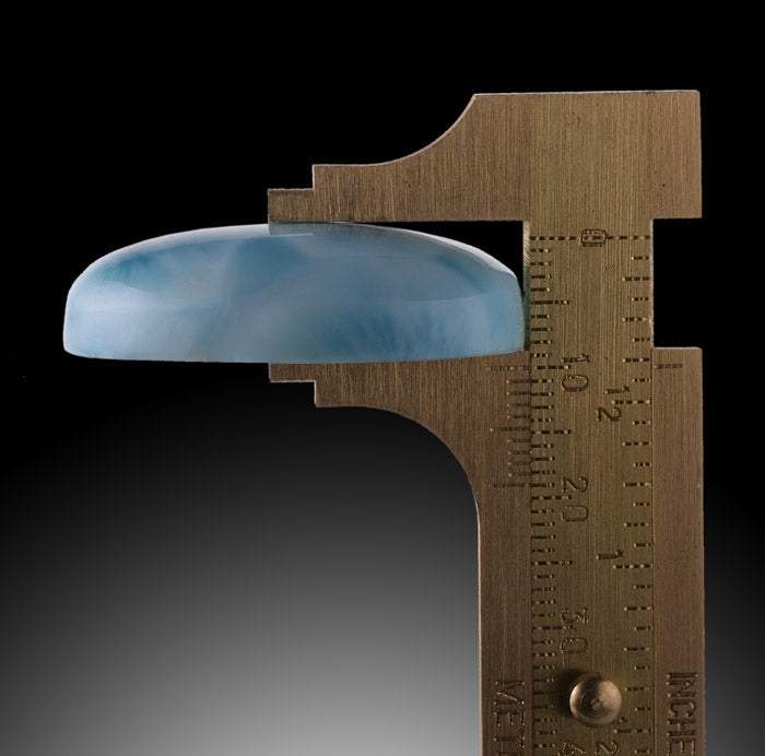 Perfect for a pendant setting or just as a specimen is this 9mm thick Larimar cabochon. The white spider pattern helps to highlight the deep blue located throughout this cab.