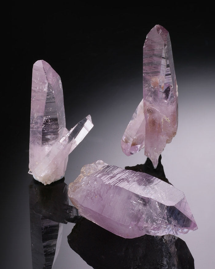 Smaller clusters of Vera Cruz Amethyst. Often there is one larger crystal with 1-2 smaller crystals on the side. Color is a very pale lavender with most of the color showing on the tip. Some of the crystals are single crystals, but have natural terminations on each end. At the time of purchase, we hope you trust us to choose an excellent specimen for you.