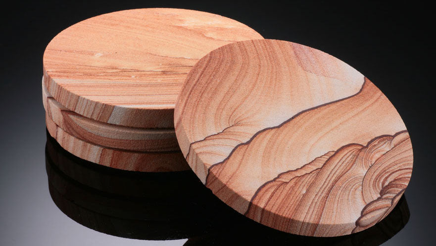 These sandstone coasters are the perfect gift for anyone. They absorb humidity exceptionally well, and their beauty makes for a nice conversation piece. All coasters have a thin layer of cork attached to their bottoms to prevent scratching your furniture.