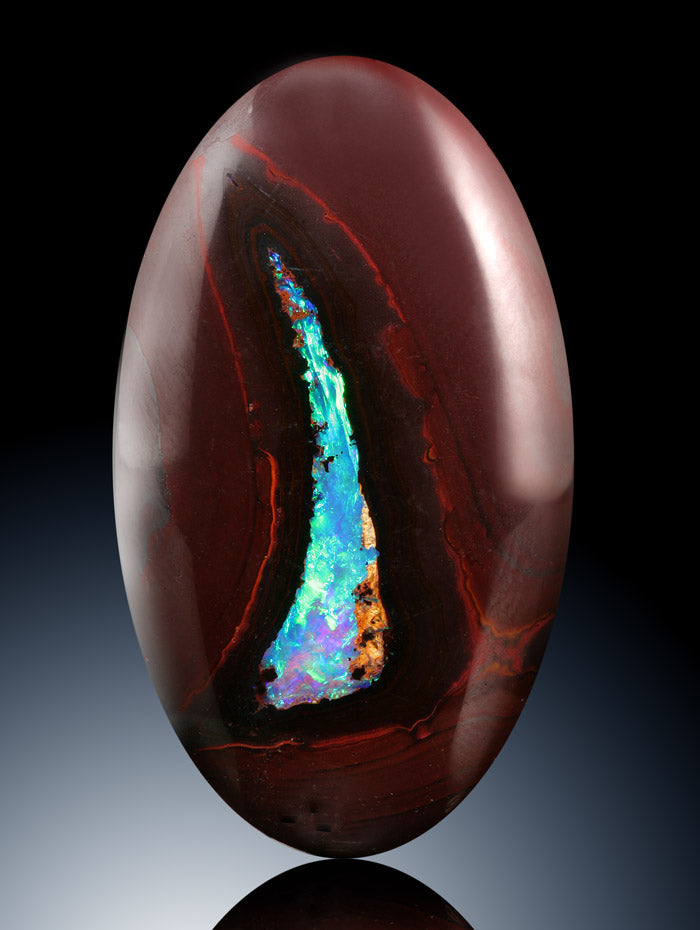 Opal is composed of hydrated silica. It is an amorphous silicate, meaning it does not form crystals. Opals are structurally composed of tiny spheres of silica, which when arranged in perfect geometry create the famous play of color associated with the stones. The arrangement of silica balls acts like a prism, which allows the rainbow spectrum of colors to be visible to the naked eye. Opal has been a stone of myth and mysticism for thousands of years. It was once worn for protection against sorcery and to enhance a person’s magical qualities. The idea that Opals are unlucky came about in 1829 after the publication of Scottish novelist Sir Walter Scott’s book Anne of Geierstein. In the novel, an Opal amulet signifies the downfall of the heroine, and this act of literature negatively affected the entire Opal industry for generations.